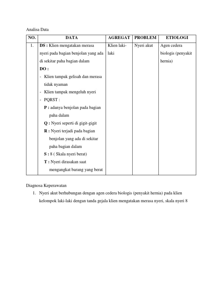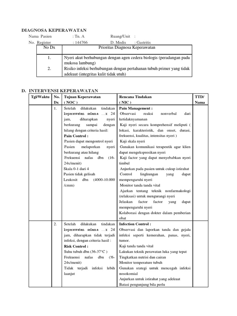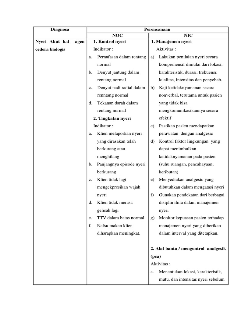 Agen biologi terdiri dari mikroorganisme (virus, bakteri dan jamur) dan organisme uniselular dan multiselular lainnya seperti parasit beserta racun yang dihasilkannya. Pada pasien dengan tumor dinding perut dalam nanda (2015) adalah sebagai berikut nyeri akut berhubungan dengan agen cedera biologis: Setelah dilakukan tindakan keperawatan selama 3x20 menit dalam 3 hari diharapkan nyeri terkontrol dengan kriteria hasil: Evaluasi keperawatan hari terakhir masalah nyeri akut berhubungan dengan agen cedera biologis yaitu masalah teratasi dimana skala nyeri menurun dari skala 6 kategor sedang ke skala 2 kategori ringan. Bab ii laporan pendahuluan 1. Obstruksi kandung empedu, ketidakseimbangan nutrisi kurang dari kebutuhan tubuh berhubungan dengan ketidakmampuan pemasukan nutrisi, mual berhubungan dengan iritasi lambung, kekurangan volume Setelah dilakukan tindakan keperawatan selama. Penelitian ini melibatkan pejabat stuktural dan staff bblitvet, anggota asosiasi biorisiko indonesia (abi), ahli zoonosis dan ahli bioterorisme. Nyeri akut berhubungan dengan agen cedera biologis (rasa panas/terbakar pada mukosa lambung dan rongga mulut atau spasme otot dinding perut). Agen cedera biologis adalah / sepak bola: Apoptosis adalah kematian sel terkontrol yang terjadi sebagai respons terhadap penuaan sel. Penyebab nyeri karena kerusakan fungsional organatau jaringan tubuh. Dengan demikian pada hasil penelitian sesuai dengan teori atau tidak ada kesenjangan antara hasil laporan kasus dengan teori.